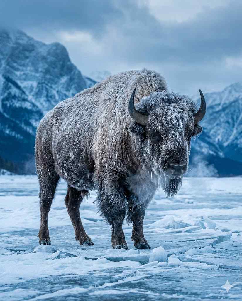In the heart of winter, nature unveils some of its most breathtaking spectacles, where survival meets sheer beauty. The image before us—a majestic bison standing resolute on a frozen lake, its thick fur encrusted with frost, breath visible in the frigid air, and jagged mountain peaks looming in the misty background—encapsulates this perfectly. This isn’t just a photograph; it’s a window into the raw power and adaptability of one of North America’s most iconic animals. Taken in what appears to be the unforgiving landscapes of the Rocky Mountains, possibly in Yellowstone National Park or nearby Grand Teton, this scene reminds us of the delicate balance between wildlife and their harsh environments. As we delve into this blog post, we’ll explore the story behind such images, the biology of bison in winter, photography tips for capturing similar moments, and the ongoing conservation efforts to protect these magnificent creatures. Let’s journey into the frozen wilds.