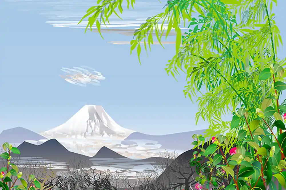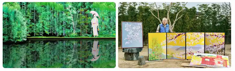 His works often depict serene Japanese nature: blooming cherry blossoms over ancient castles, cascading waterfalls like Kegon Falls, misty mountains, tranquil gardens, and snowy landscapes. The style evokes traditional ukiyo-e woodblock prints, with delicate details in flowers, water ripples, and foliage that fool the eye into thinking they’re traditional paintings.